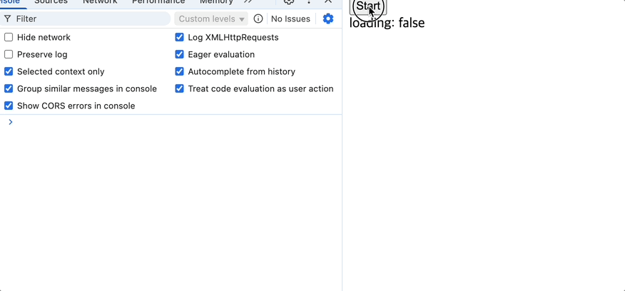 start 버튼을 눌렀을때 로딩상태가 true -> false일것을 기대하지만 실제로는 계속 false인 상태인것을 확인 할 수 있다.